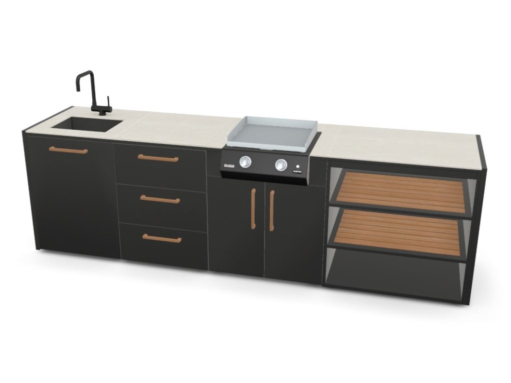 Sestavte si venkovní kuchyňskou linku dle vašich požadavků – modulární systém umožňuje libovolné uspořádání jednotlivých modulů a široké možnosti jejich konfigurace. Kuchyňskou linku lze sestavit i do tvaru L nebo U, případně můžete zvolit ostrovní uspořádání.