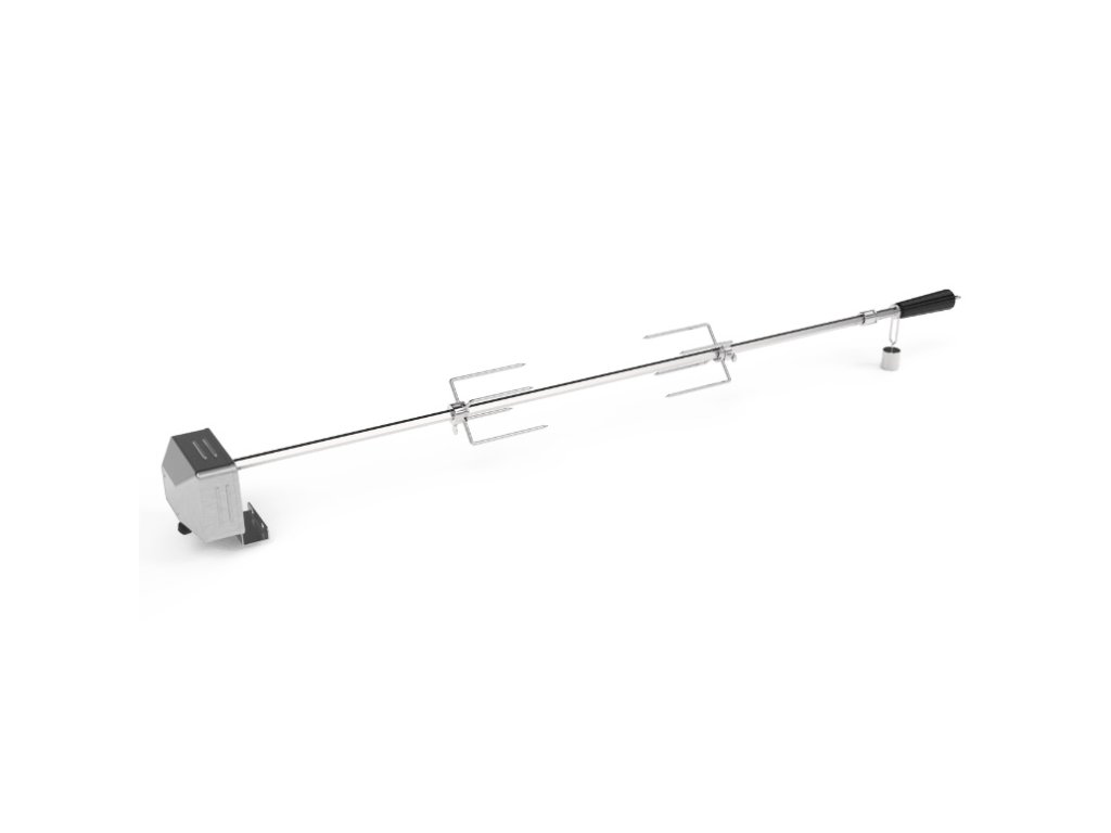 Otočný rožeň z nerezové oceli včetně elektrického motorku. Sestava obsahuje středovou špízovou jehlu, dva unášecí trny a protizávaží.
