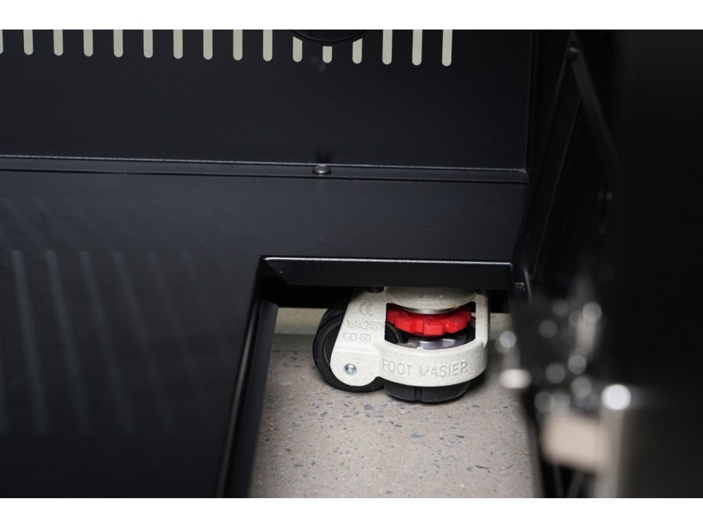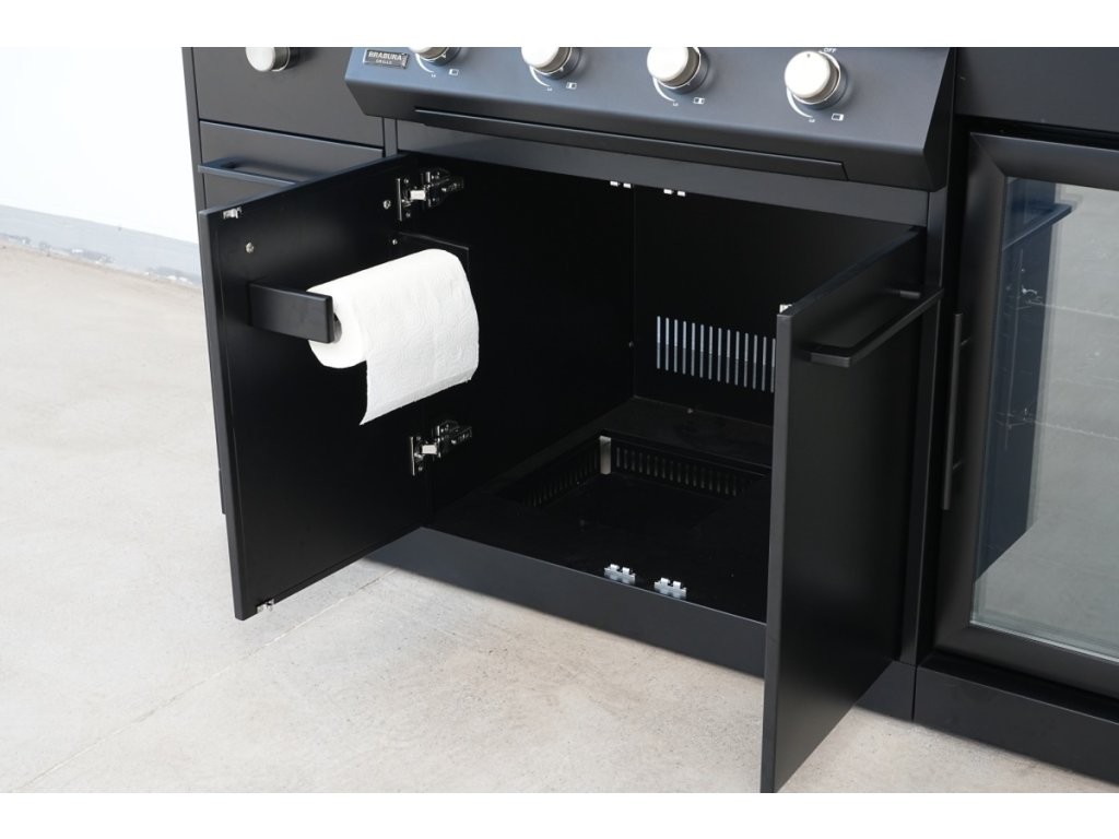 - Úložná skříňka pod grilem: Skříňka s dvířky pro ukládání příslušenství ke grilu je doplněna držákem utěrek a prostorem pro umístění PB lahve.