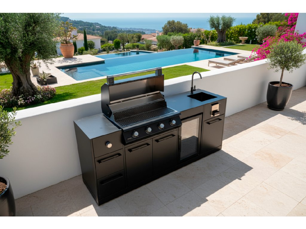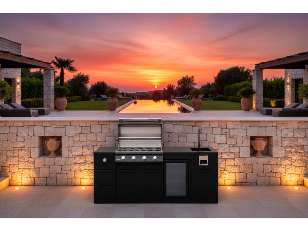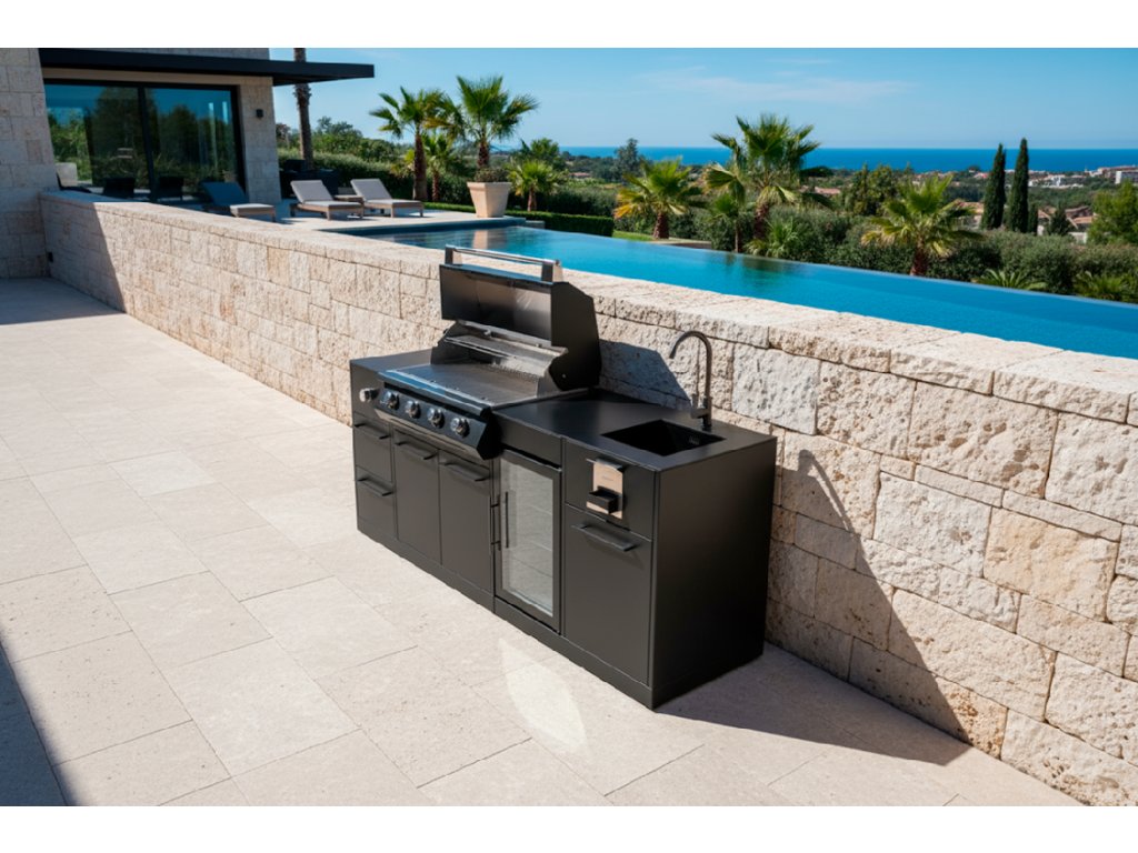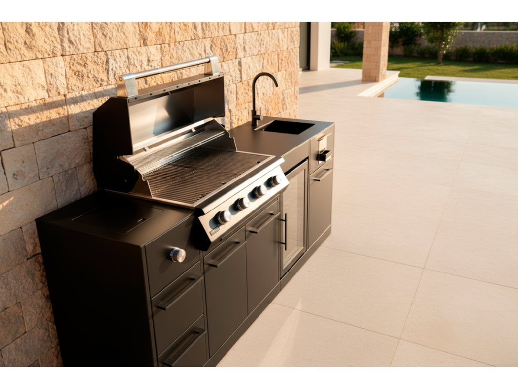 Exkluzivní venkovní kuchyňská linka BRABURA s grilem Lite 400 osazená prvotřídními spotřebiči a luxusním provedením.