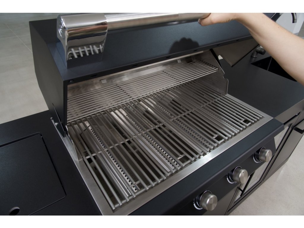 Předností tohoto grilu je velká grilovací plocha, velký výkon, nerezové provedení a pěkný vzhled. - Plynový vařič s krycím poklopem: Úzká skříňka se dvěmi výsuvnými zásuvkami na nádobí a doplňky je v horní části osazena zapuštěným plynovým vařičem, který využijete na ohřívání, nebo vaření. Zavírací víko vařiče je provedeno ze stejného materiálu jako je pracovní deska.