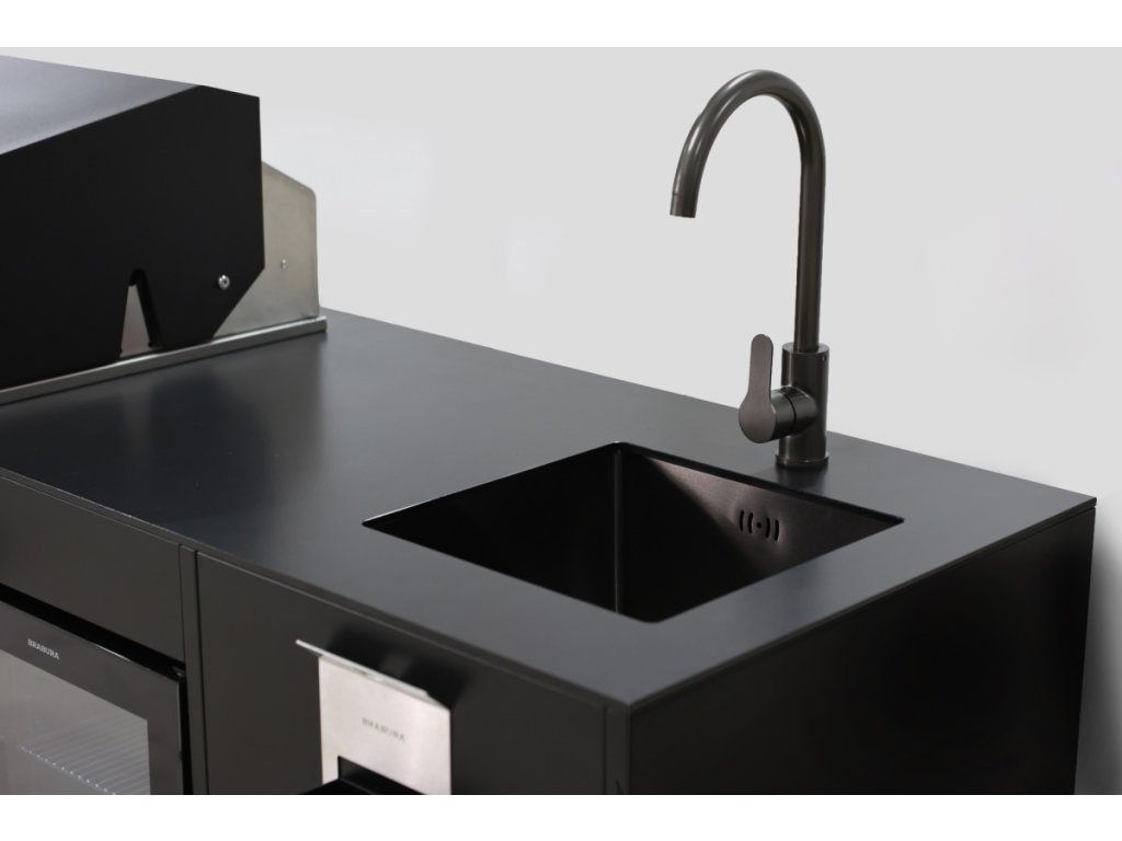 - Dřez s vodovodní baterií: Dřez s vodovodní pákovou baterií osazený v pracovní desce z odolného slinutého kamene. Dřez a baterie jsou vyrobeny z černěné nerezové oceli. Vodovodní baterii lze napojit na přívod teplé a studené vody, nebo připojit pouze na studenou vodu ze zahradního rozvodu vody.