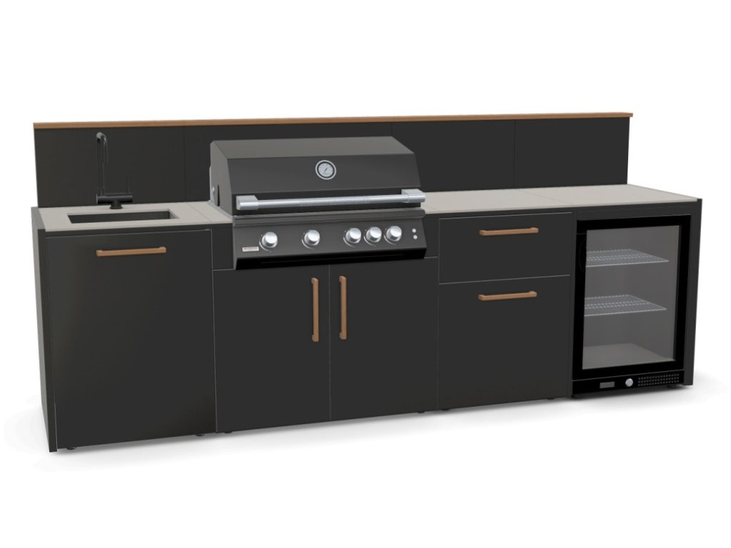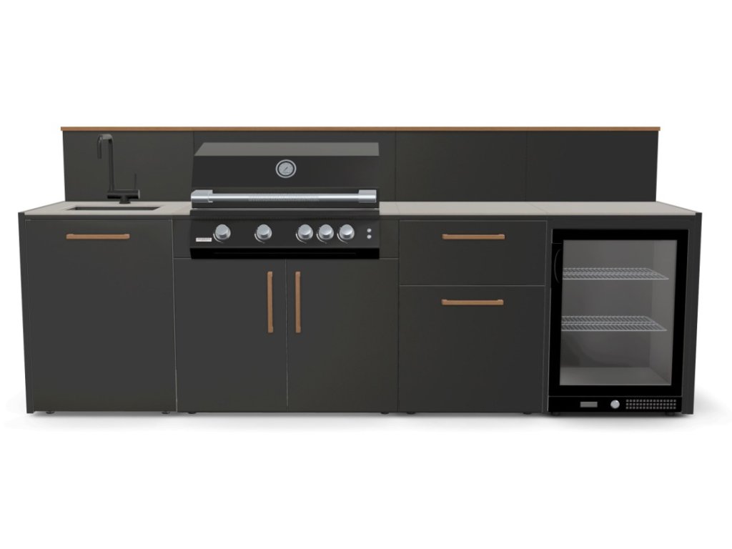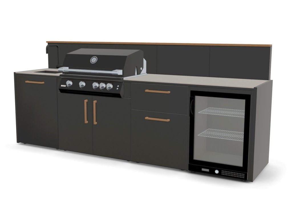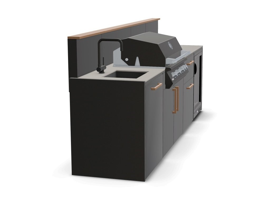 Sestavte si venkovní kuchyňskou linku dle vašich požadavků - modulární systém umožňuje libovolné uspořádání jednotlivých modulů a široké možnosti jejich konfigurace. Můžete zvolit různé typy grilů, chladničku, dřez s vodovodní baterií, různé provedení úložných skříněk, materiál madel skříněk a zásuvek, vzhled (barvu) skříněk, zadní stěnu a především odstín pracovní kamenné desky. Kuchyňskou linku lze sestavit i do tvaru L nebo U, případně můžete zvolit ostrovní uspořádání.