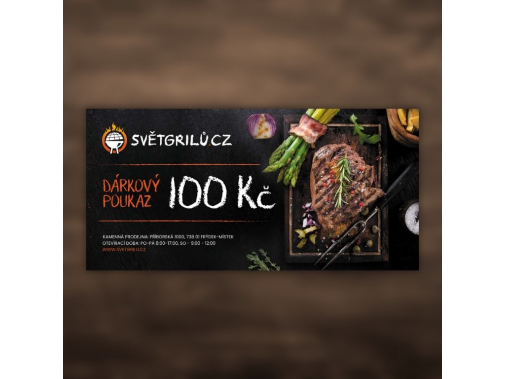 Dárkový poukaz k nákupu zboží z celého sortimentu v našem e-shopu a kamenné prodejně Svět grilů. Když si nevíte rady, když se nemůžete rozhodnout, jaký dárek koupit, máme pro vás snadné řešení: kupte Dárkovou poukázku na nákup v našem kamenném nebo internetovém obchodě SVĚT GRILŮ. Obdarujte své blízké, přátele a spolupracovníky! Na výběr máte čtyři různé hodnoty. Zde je to 100 Kč.