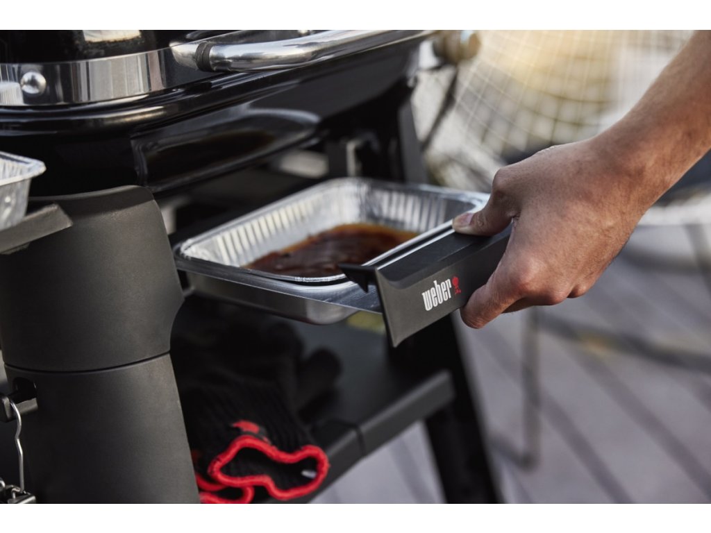 Boční lišty podstavce grilu se dvěma integrovanými háčky podporují příslušenství Weber Works, se systémem Snap-On, které lze dokoupit: