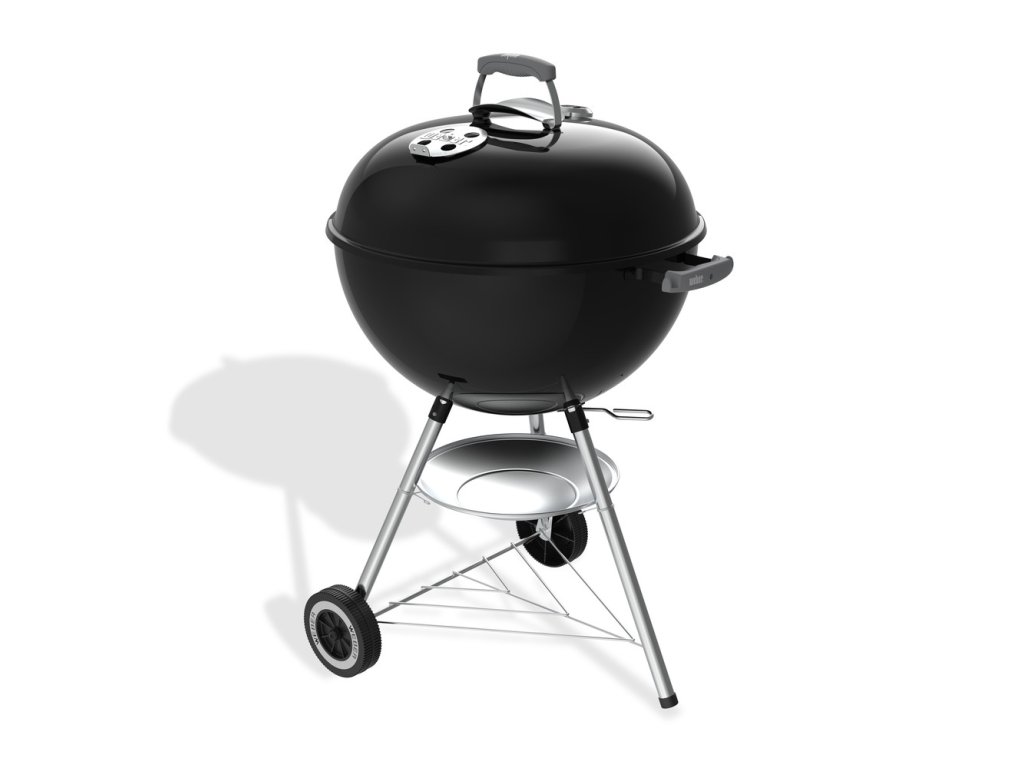 Černý ORIGINAL KETTLE s tradiční Weber siluetou, se zabudovaným patentovaným čistícím a větracím systémem One-Touch, miskou k zachycení popele a integrovanou termosondou v poklopu ke správné regulaci teploty.
