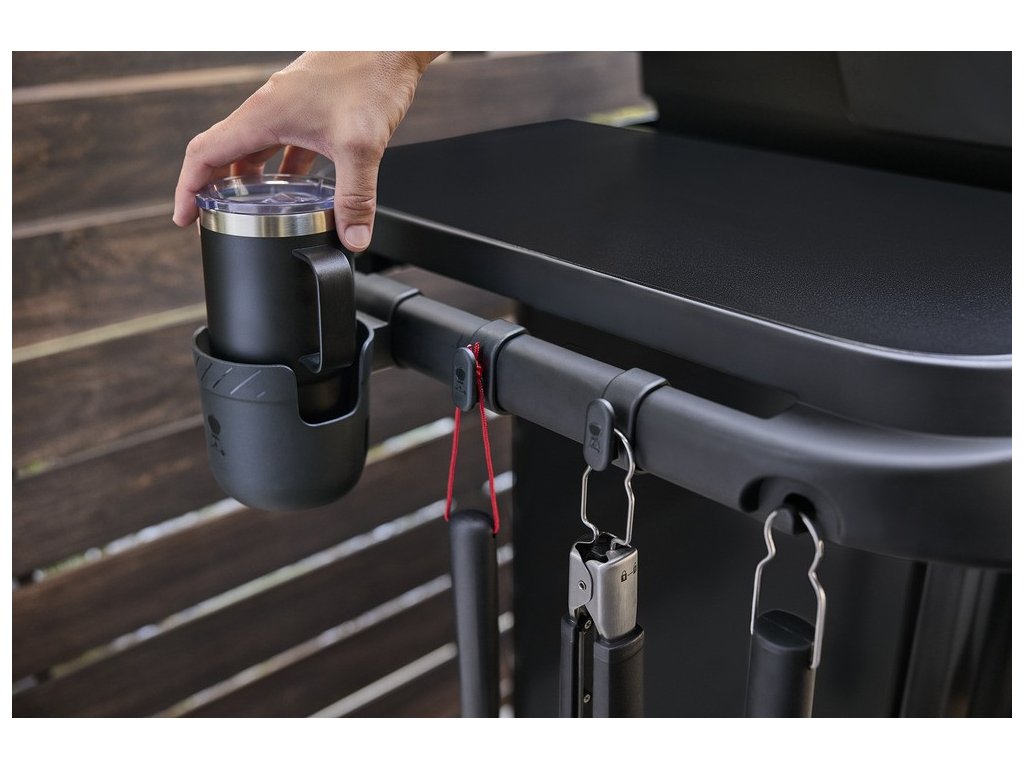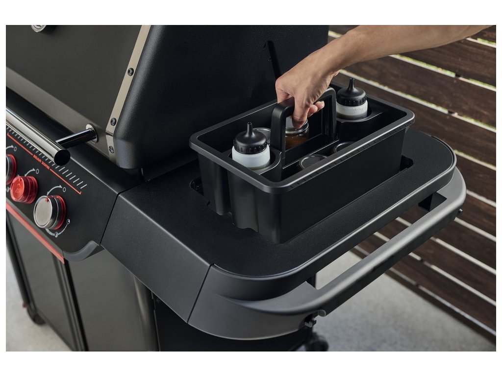 - Boční odkládací stolky: Nerezové postranní police poskytují dostatek prostoru pro přípravu potravin a odkládání nářadí. V levém stolku je pod nerezovým víkem umístěn kruhový plynový vařič. Pravý stolek je připraven na použití příslušenství Weber Works velké provedení (vkládá se do otvoru pod krycí deskou stolku). V čele pravého stolku je digitální teploměr pro přesné určení teploty v grilu. Oba stolky jsou z boční strany osazeny madly, která lze využít pro osazení doplňky systému Weber Works Snap On.