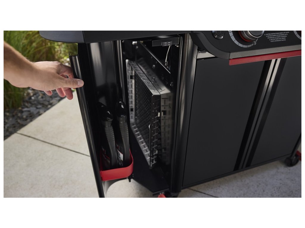 - Velká postranní skříňka: Pod levým stolkem je doplněna velká postranní skříňka na příslušenství, ideální pro uložení příslušenství Weber Crafted.