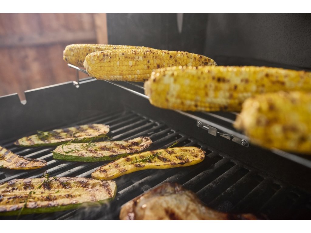 - Odkládací - ohřívací rošt: Nad grilovacím roštem je osazen ohřívací rošt, který lze využít na ohřívání potravin, nebo třeba pro rozpékání pečiva.