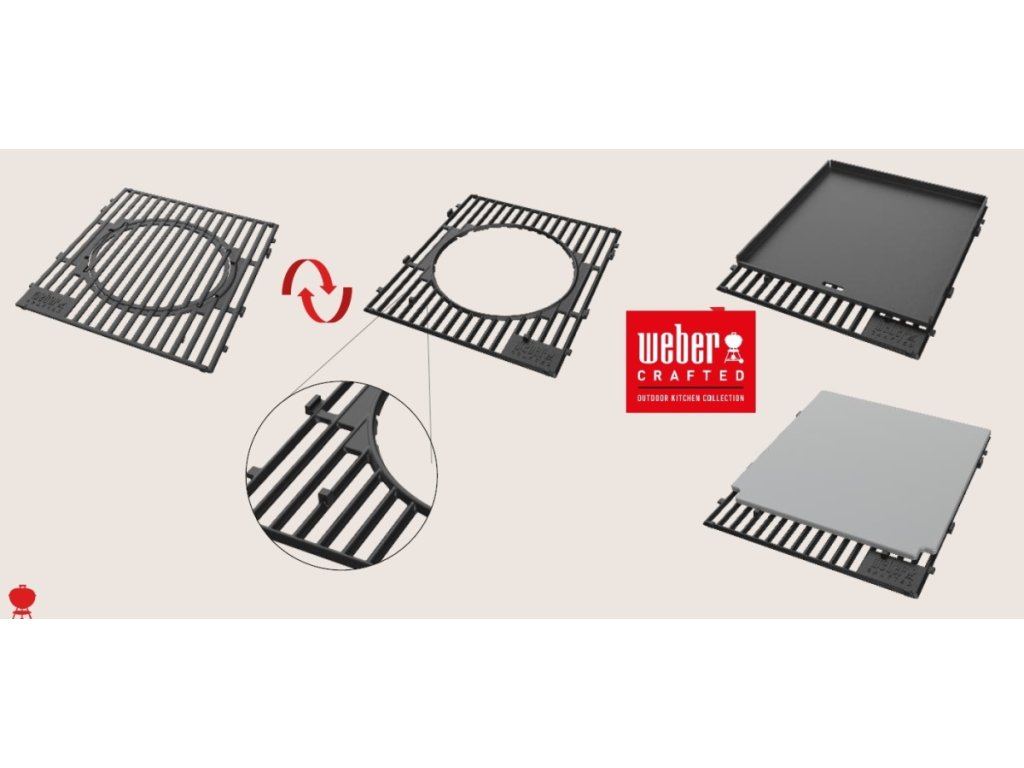 - Hlavní grilovací plocha: Grilovací plocha s masivními oboustrannými litinovými porcelánem smaltovanými rošty Weber Crafted. Rošty jsou kompatibilní s příslušenstvím Weber Crafted - lze jednoduše rošt otočit a vložit na rošt příslušenství Weber Crafted ve tvaru čtverce (pizza kámen, litinový tál, nerezový koš, rošt sear grate), ale i kruhové příslušenství GBS (wok pánev, pánev paella, pizza kámen, rošt Sear Grate, litinový hrnec, stojan na drůbež).
