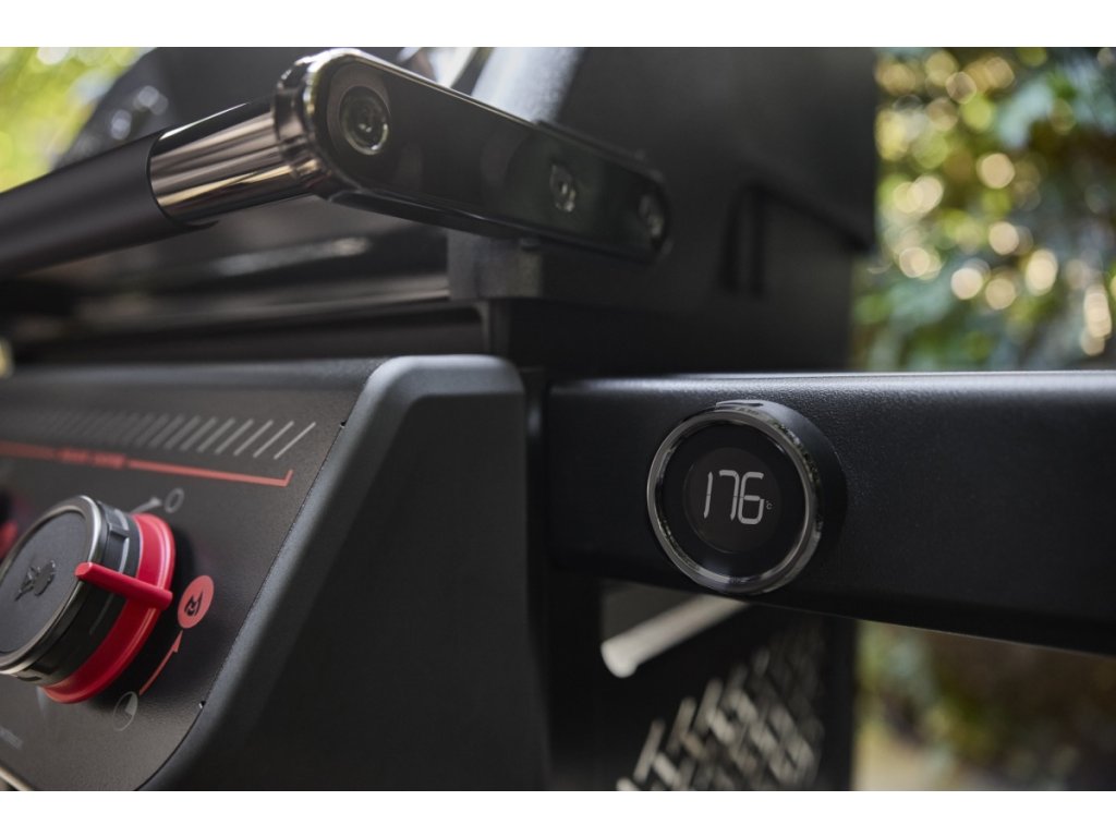 - Digitální teploměr s integrovanou technologií Weber Connect: Na přední straně pravého stolku je osazen digitální teploměr, který lze připojit pomocí Wi-Fi a Bluetooth k chytrému telefonu a pomocí aplikace Weber Connect můžete sledovat průběh grilování. Teploměr je vybaven drátovou sondou do masa a lze k němu připojit (bezdrátově) dvě další bezdrátové sondy (není součástí). Aplikace Weber Connect zobrazuje teplotu v pokrmu a teplotu v grilu, upozorňuje na dosažení požadované teploty a zobrazí vám i recepty s průvodcem grilování a instruktážní videa k využití maximálních možností vašeho grilu. Aplikace umožní zobrazit i grafy a přehledy o grilování.